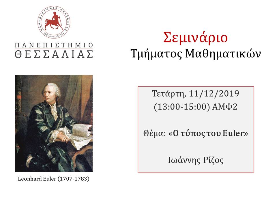 | Σεμινάριο Τμήματος Μαθηματικών 11/12/2019 Δημιουργός: ΙΩΑΝΝΗΣ ΡΙΖΟΣ Ο τύπος του Euler |